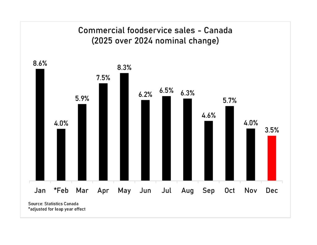 Despite slower spending in November and December, total foodservice sales for 2025 increased by a solid 5.6% compared to 2024. This result exceeded initial expectations amid ongoing economic uncertainty and tariffs from the United States. Strong domestic tourism and the temporary GST/HST holiday helped support consumer spending and contributed to the stronger-than-anticipated annual performance.